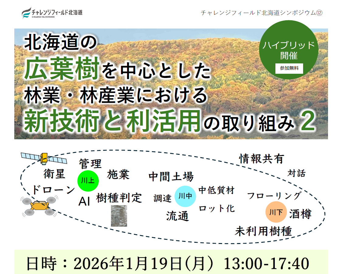 CLOSE 終了しました【1/19(月)】チャレンジフィールド北海道シンポジウム「北海道の広葉樹を中心とした林業・林産業における新技術と利活用の取り組み2」2026/01/19 (Mon)セミナー -