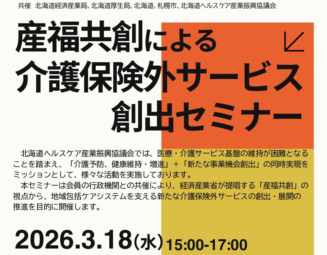 経済産業省北海道経済産業局、厚生労働省北海道厚生局、北海道、札幌市、北海道ヘルスケア産業振興協議会は、地域包括ケアシステムの構築を支える新たな介護保険外サービス創出を目的としたセミナーを開催します。